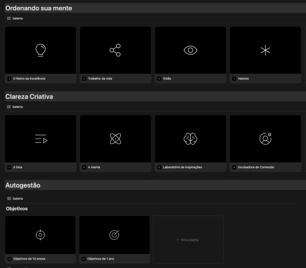 Isso, eu tirei em um dos templates do Caminho do Criador. Onde preparei um mapa de organização, metas, objetivos e muitas outras coisas.