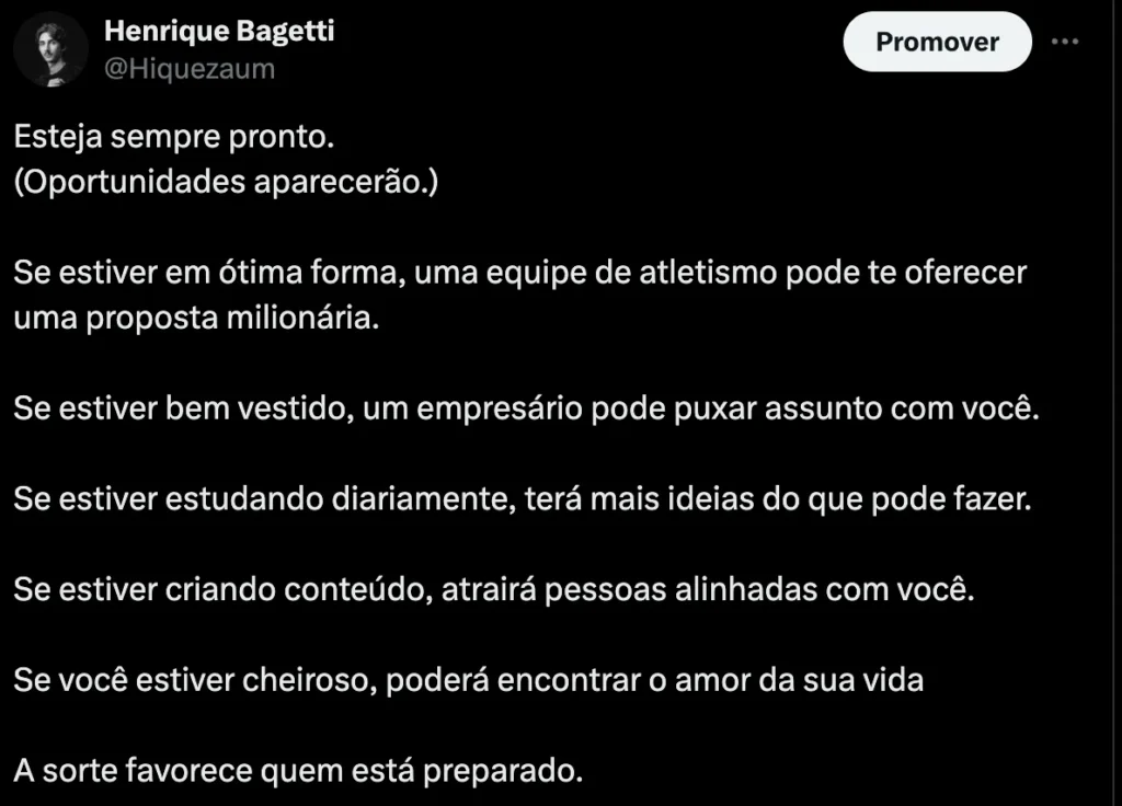 Não, cara. Você não vai ficar rico ou ter sucesso vendendo seu tempo por dinheiro (trabalhando para outra pessoa). Você não vai ter sucesso compartilhando reels de Lamborghini motivacional com seu melhor amigo. Você não vai ter liberdade se não começar a criar algo para o mundo.