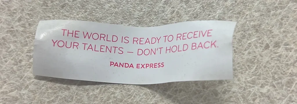 Nesse mesmo dia, pedi um lanche no Panda Express e recebi uma cartinha que guardo até hoje: “The world is ready to receive your talents! Don’t hold back!” (“O mundo está pronto para receber seus talentos! Não se segure!”)