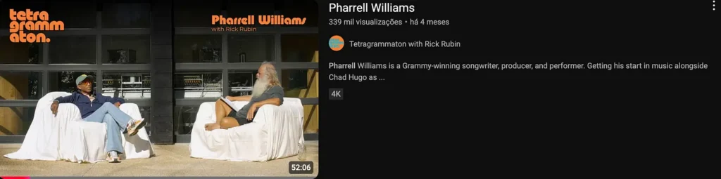 Pharrell Williams é um cantor, compositor, produtor e empresário americano, famoso por seus sucessos como Happy e por sua dupla de produção musical The Neptunes. Ele também é designer e ativista, com envolvimento em moda e causas sociais. Eu amei esse podcast de um do Rick Rubin (um dos caras que mais me inspirou na criatividade).